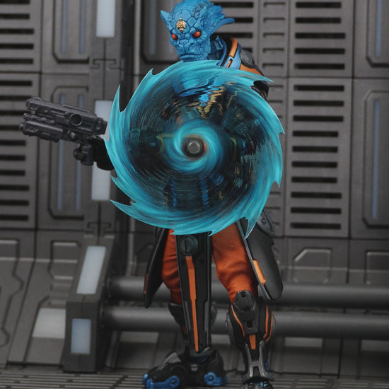 This piece is compatible with the peg system that comes standard with most Cosmic Legions figures, and can be attached by slipping it on over one of those pegs via the center socket. As such, this piece is meant for usage with Cosmic Legions figures, and is not guaranteed to work with any other figure lines. There is another version of this effect available that does have wider compatibility.