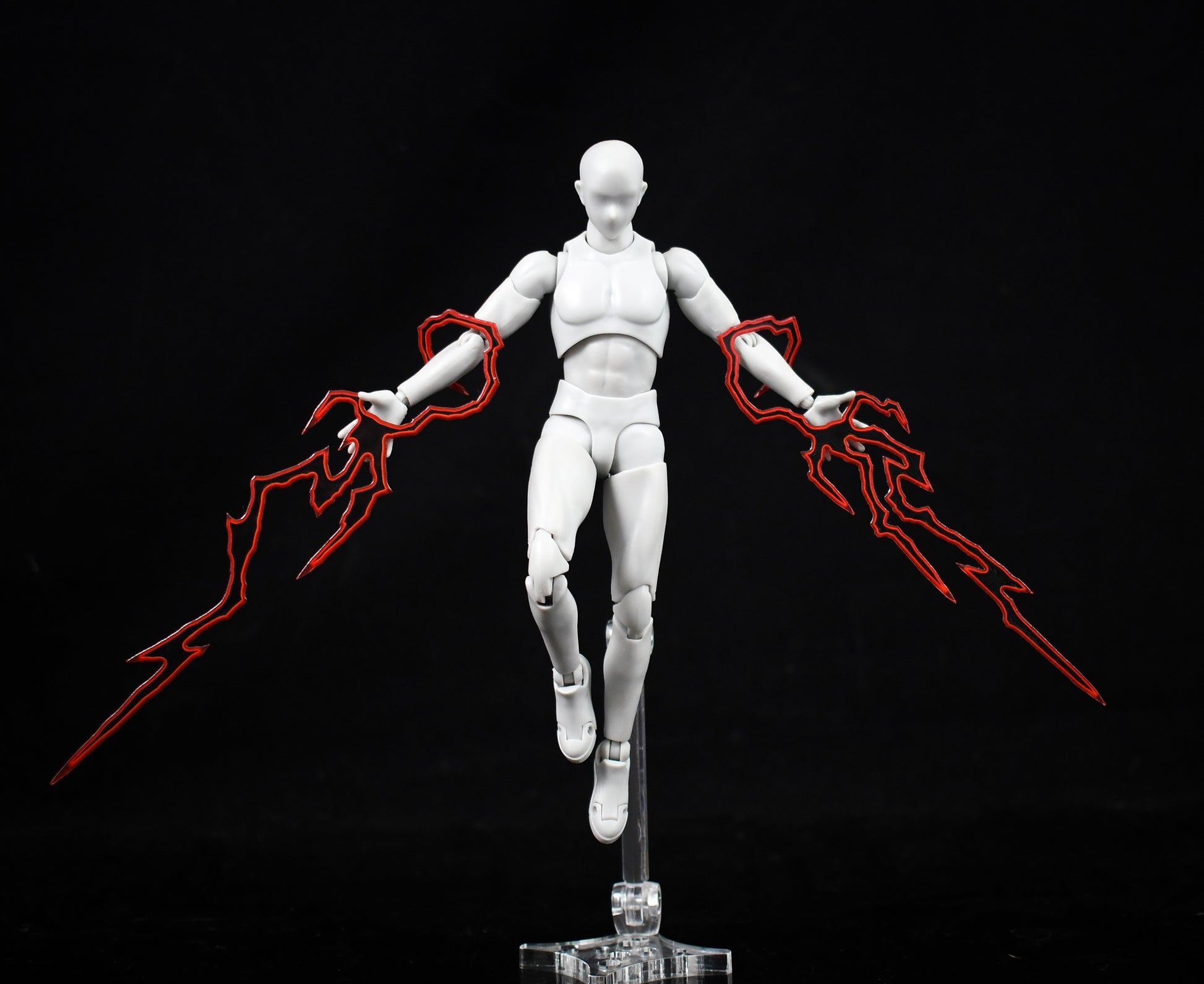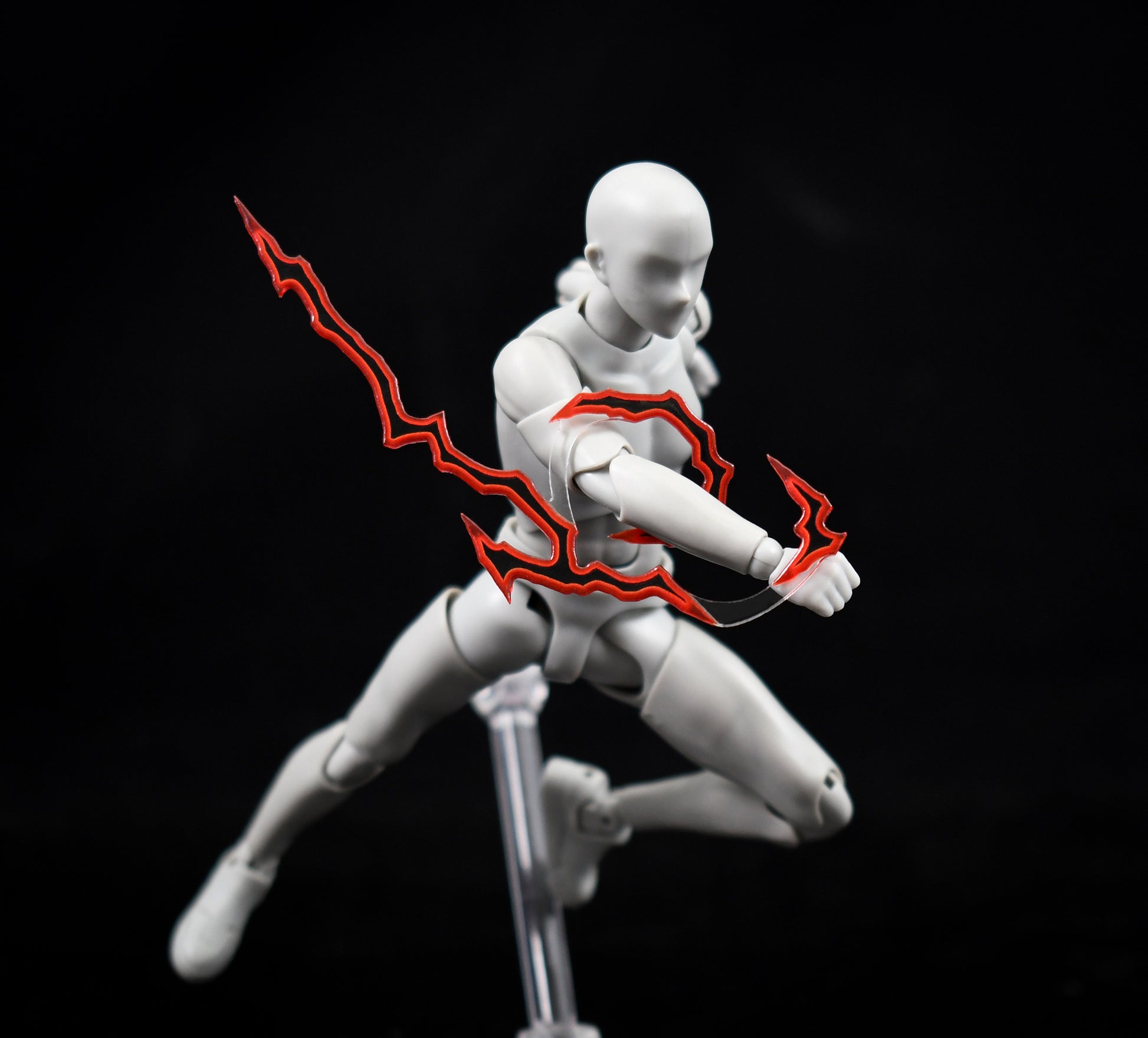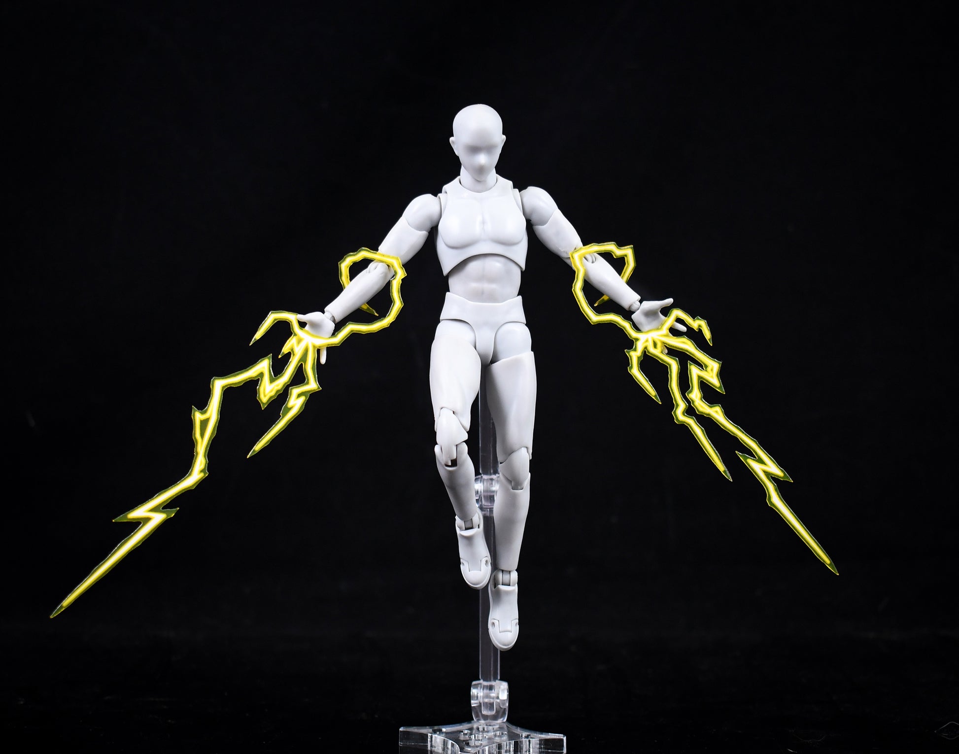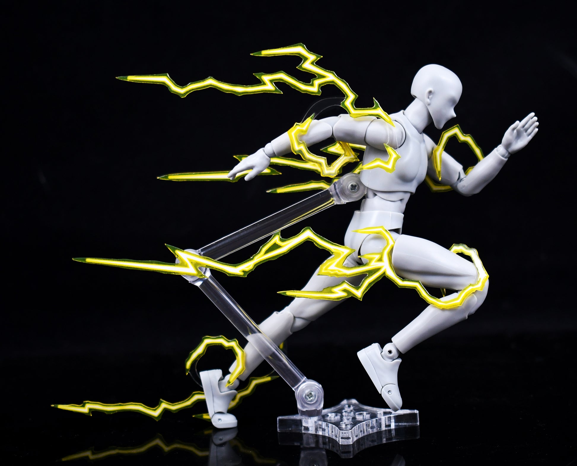 Each Lightning Effect Set contains 4 unique pieces. They are in different shapes and configurations to work with as wide a range of figures are possible in the near 1:12 scale. They utilize a mix of transparency and sculpted 3d elements to create the appearance of many smaller trails of lightning out of the 4 pieces.
